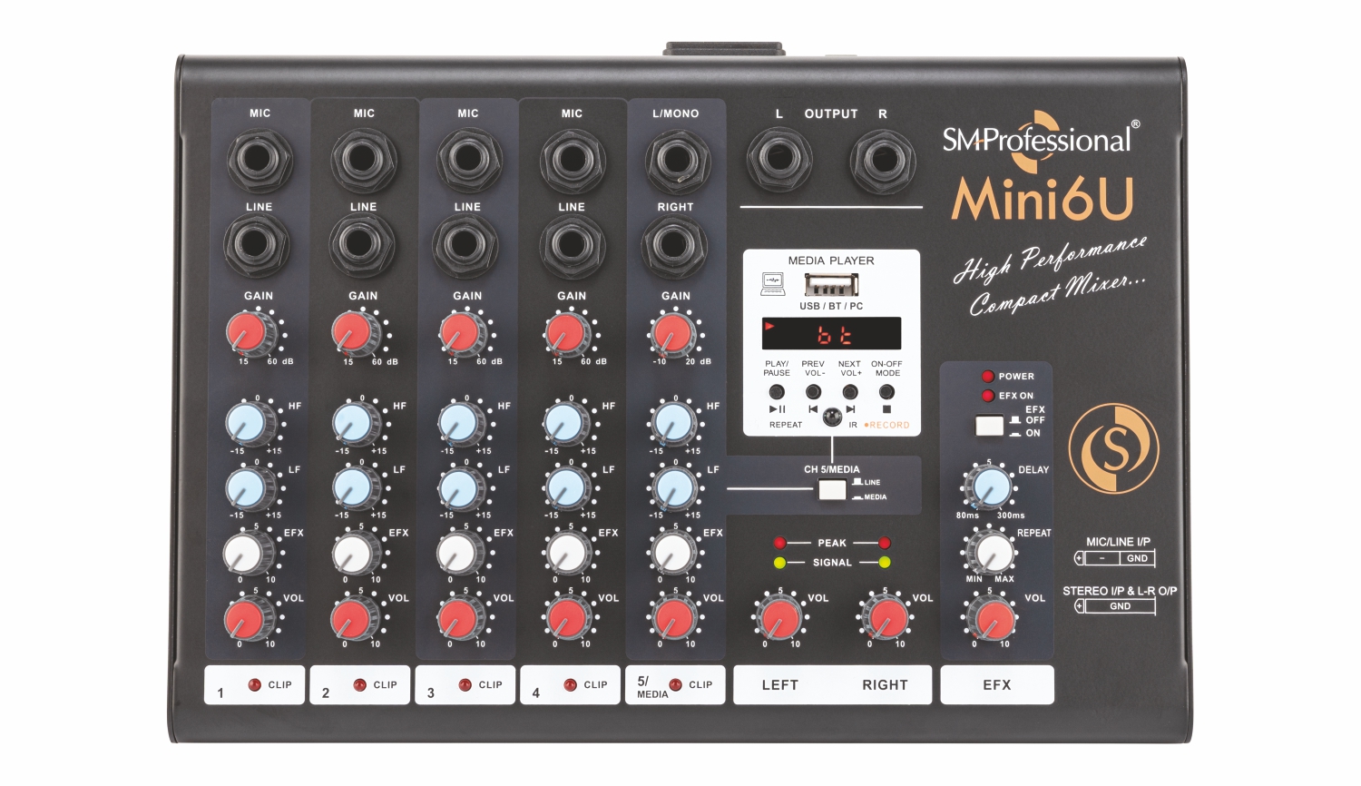 Balanced XLR mic input with gain and 3-band EQ.